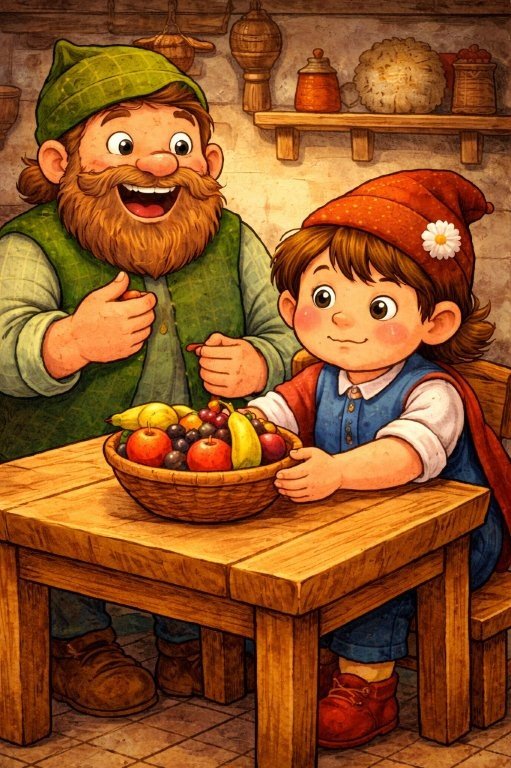 «Είσαι πράγματι πολύ σοφή», είπε τότε η κυρία Κουκούτσι, που κατάλαβε ότι μόνο όταν ο Σπόρος δει τους σπόρους να μεγαλώνουν, να γίνονται δέντρα ψηλά και με τη δική του φροντίδα και αγάπη να δίνουν όμορφους και θρεπτικούς καρπούς θα καταλάβει ότι κι αυτός για να μεγαλώσει, χρειάζεται αγάπη, φροντίδα, αλλά και φρούτα.