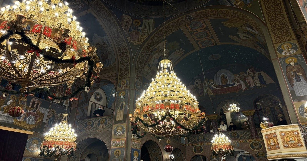 Οι μεγάλοι πολυέλαιοι, στολισμένοι με πράσινα κλαδιά και κόκκινες πινελιές, αιωρούνται σαν φωτεινοί πλανήτες μέσα σε έναν μικρόκοσμο που υπενθυμίζει την τάξη και την αρμονία της δημιουργίας. Το φως που εκπέμπουν γίνεται σύμβολο της θείας παρουσίας που διαχέεται στον κόσμο και τον αγιάζει.
