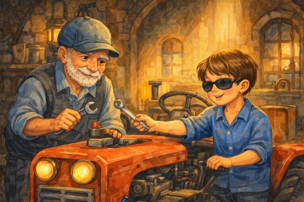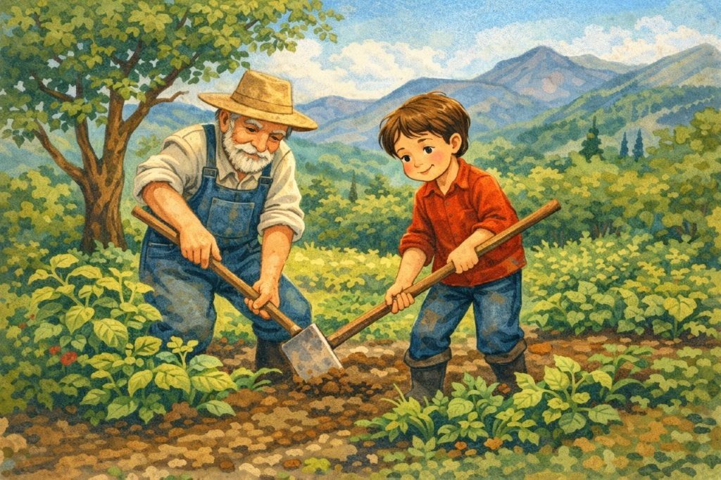 Όσο για τους γονείς του, πάντα χαμογελούσαν όταν τον έβλεπαν, πότε να τρέχει για τα ψώνια που του ζήτησε η καημένη η γιαγιά Μαρία, που δεν την κρατούσαν πια τα πόδια της, πότε να πιάνει το τσαπί και να βοηθά τον κυρ-Αντρέα που αγωνίζονταν να φτιάξει τον λαχανόκηπο και που δεν είχε δικά του παιδιά να τον βοηθήσουν και πότε να μαστορεύει μαζί με τον θείο Γιώργο, που όλο του χάλαγε το τρακτέρ και πάλευε να το διορθώσει, για να οργώσει τα χωράφια, να σπείρει, να ποτίσει, να έχει καλή σοδειά.