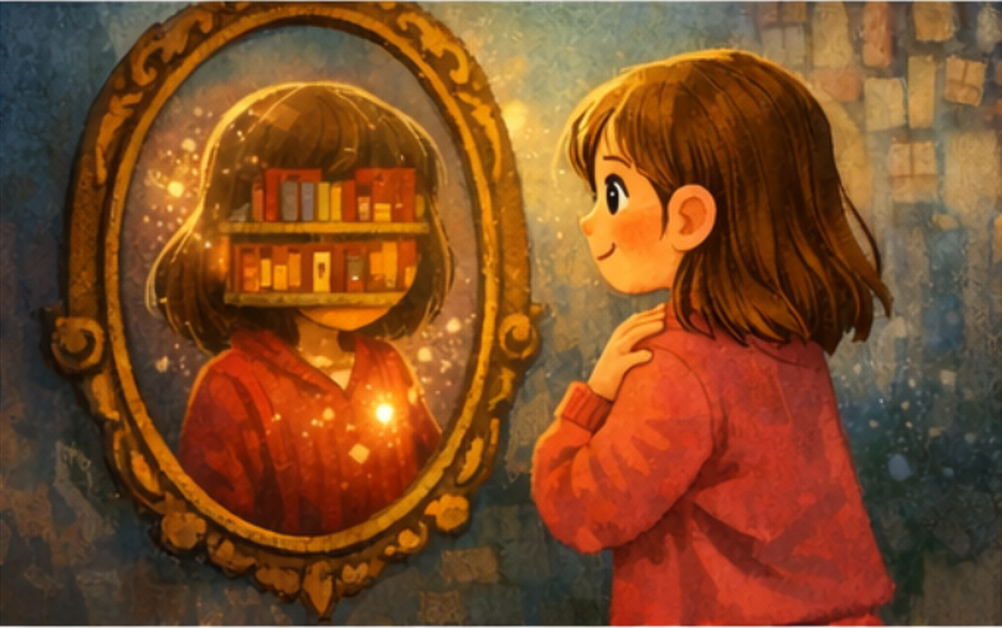 Η Μυρτώ έβαλε το κλειδί. Η πόρτα άνοιξε και μέσα δεν είχε άλλο δωμάτιο, αλλά έναν καθρέφτη. Η Μυρτώ είδε το πρόσωπό της, μα όχι όπως στον μπάνιο. Το είδε σαν να ήταν πιο βαθύ: πίσω από τα μάτια της υπήρχε μια μικρή βιβλιοθήκη με ράφια από στιγμές, λόγια, δώρα.