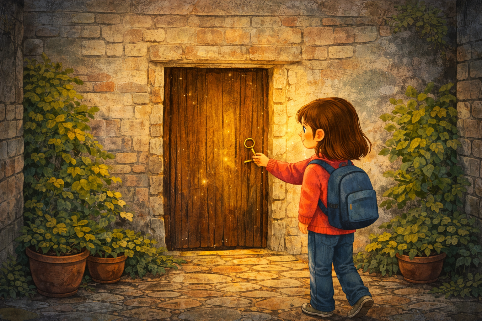 Μα δεν υπήρχε πόρτα. Μόνο ένας τοίχος, γκρι και ήσυχος. Η Μυρτώ πλησίασε. Το κλειδί στην τσέπη της χτύπησε ελαφρά πάνω στα κέρματα, σαν να ξύπνησε. Έψαξε με το χέρι και βρήκε μια κλειδαριά που δεν φαινόταν, σαν να ήταν κρυμμένη μέσα στην πέτρα.
