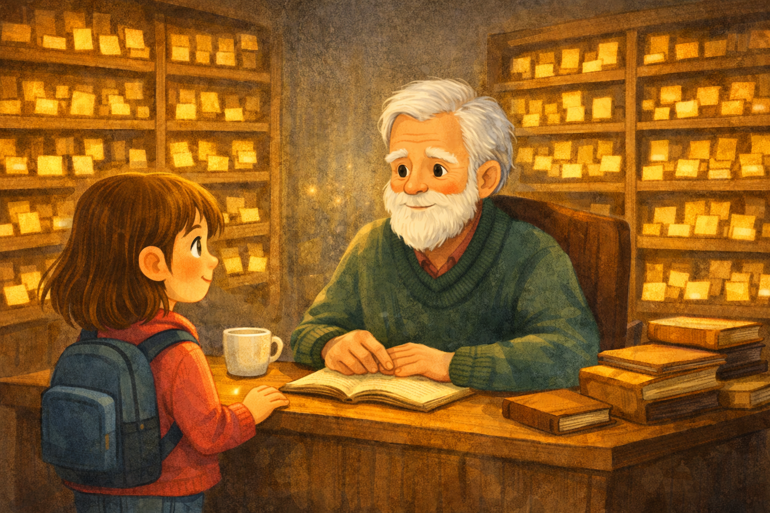 Μέσα δεν υπήρχαν ράφια με ιστορίες όπως τις ήξερε. Υπήρχαν ράφια γεμάτα μικρά χρυσά χαρτάκια, διπλωμένα σαν μικρές ευχές. Η αίθουσα ήταν φωτισμένη χωρίς λάμπες, με φως που δεν ερχόταν από κάπου συγκεκριμένα. Κι εκεί, πίσω από ένα ξύλινο γραφείο, καθόταν ένας άνθρωπος με γκρίζα μαλλιά και μάτια καθαρά σαν νερό. Φορούσε ένα απλό πουλόβερ, σαν παππούς, αλλά είχε μια γαλήνη που έκανε το δωμάτιο να μοιάζει πιο μεγάλο.