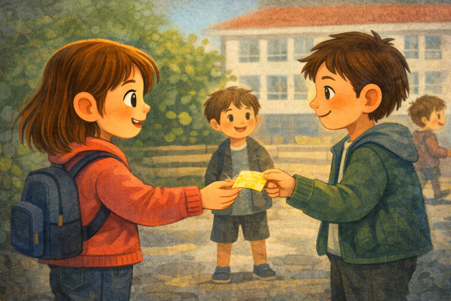 Εκείνη τη μέρα, καθώς η τάξη είχε τελειώσει και οι συμμαθητές της ξεχύνονταν έξω σαν ποτάμι, η Μυρτώ είδε κάτι παράξενο: ένα μικροσκοπικό χαρτάκι, χρυσό σαν φύλλο φθινοπώρου, να γλιστράει από την τσέπη ενός αγοριού και να πέφτει στο πάτωμα. Δεν έμοιαζε με συνηθισμένο χαρτί, μα έλαμπε σαν να είχε μέσα του μια σπίθα. Το αγόρι έτρεξε χωρίς να το καταλάβει.