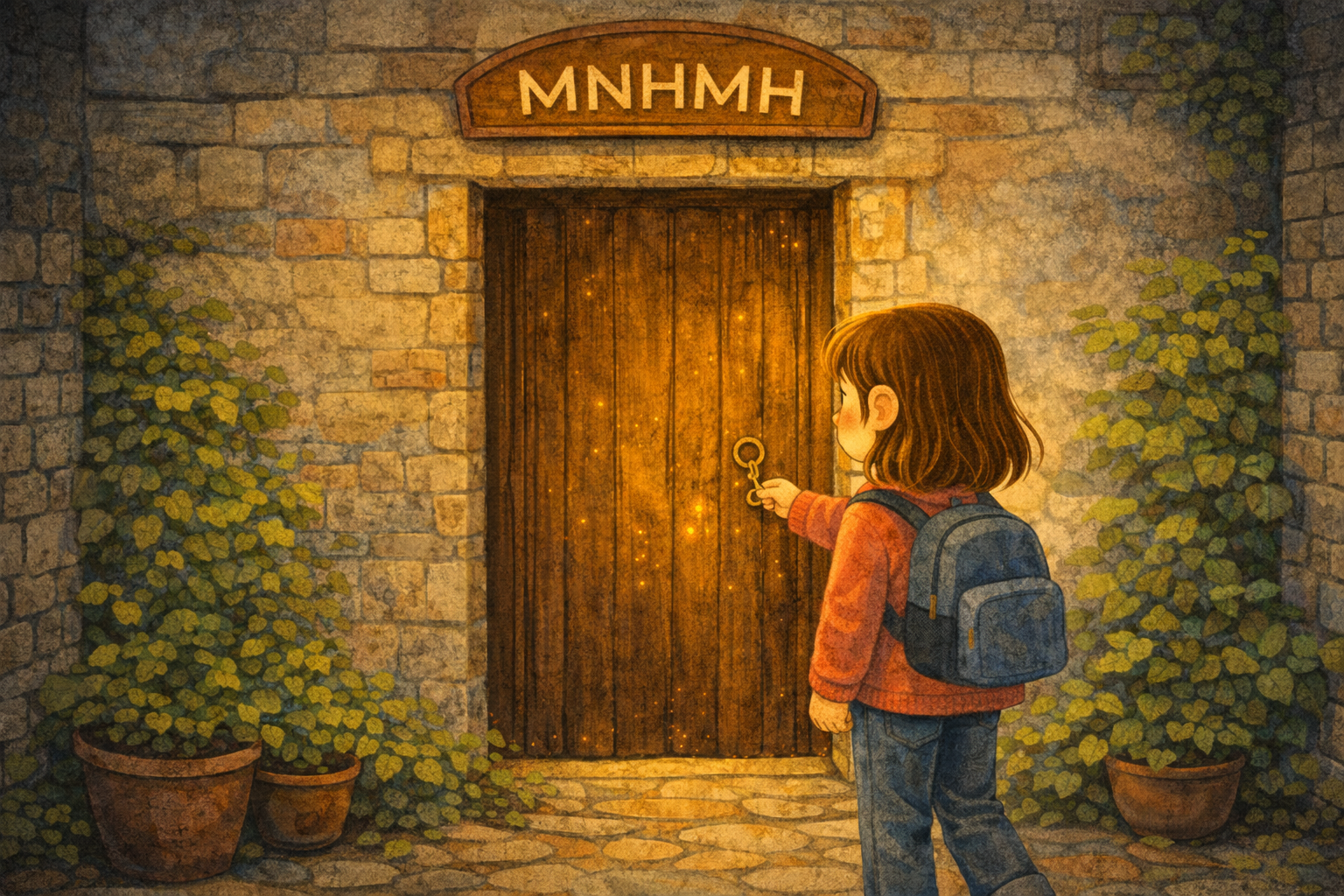 Μα δεν υπήρχε πόρτα. Μόνο ένας τοίχος, γκρι και ήσυχος. Η Μυρτώ πλησίασε. Το κλειδί στην τσέπη της χτύπησε ελαφρά πάνω στα κέρματα, σαν να ξύπνησε. Έψαξε με το χέρι και βρήκε μια κλειδαριά που δεν φαινόταν, σαν να ήταν κρυμμένη μέσα στην πέτρα.