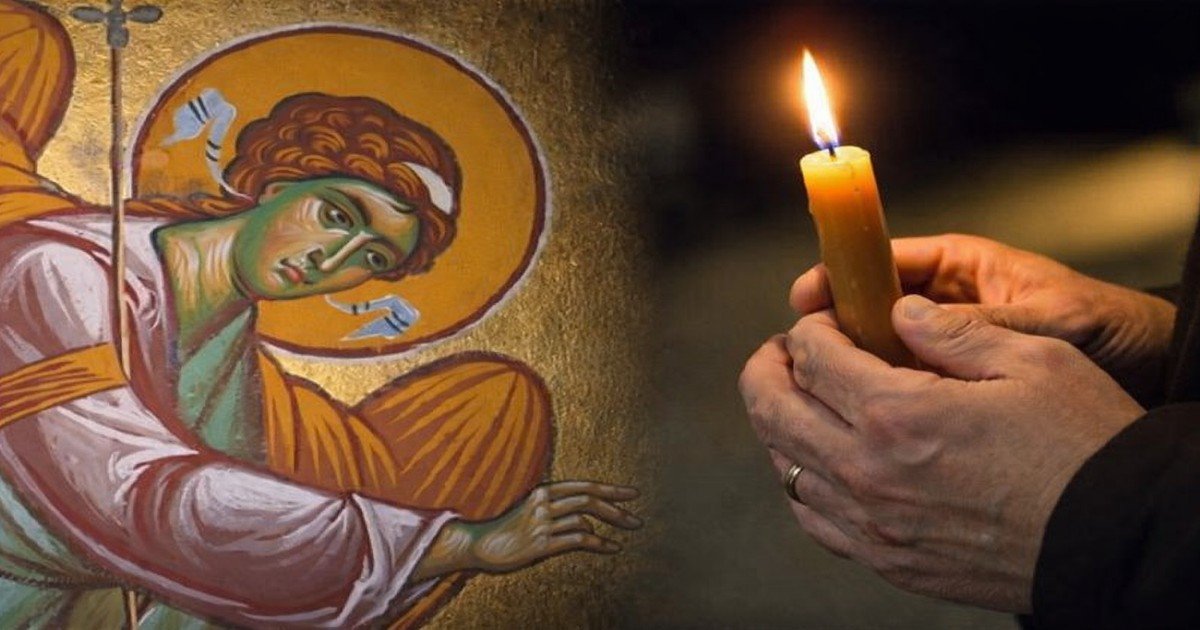 Αριστερά, ο άγγελος της αγιογραφίας αποτελεί θεολογική μαρτυρία: πρόσωπο στραμμένο προς το μυστήριο, βλέμμα που δεν κοιτά απλώς, αλλά καλεί. Δεξιά, δύο ανθρώπινα χέρια κρατούν ένα κερί. Μια μικρή φλόγα, εύθραυστη, που όμως νικά το σκοτάδι χωρίς θόρυβο. Αν η αγιογραφία είναι “παράθυρο” προς το άκτιστο φως, το κερί είναι ο τρόπος με τον οποίο η κτίση μαθαίνει να το υποδέχεται.