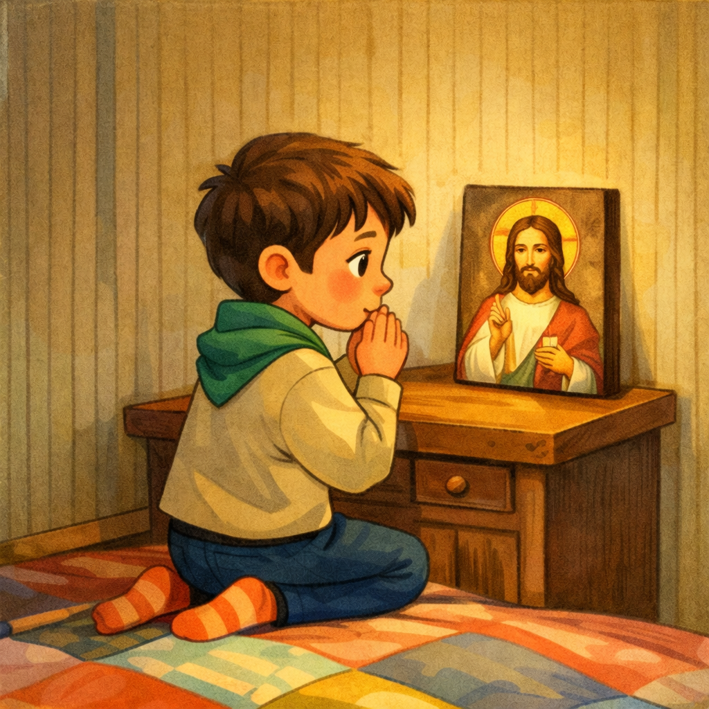Κάθε πρωί ξυπνούσε χαμογελαστός. Πριν φύγει για το σχολείο, στεκόταν μπροστά στο μικρό εικονισματάκι του Χριστού που είχε στο δωμάτιό του.