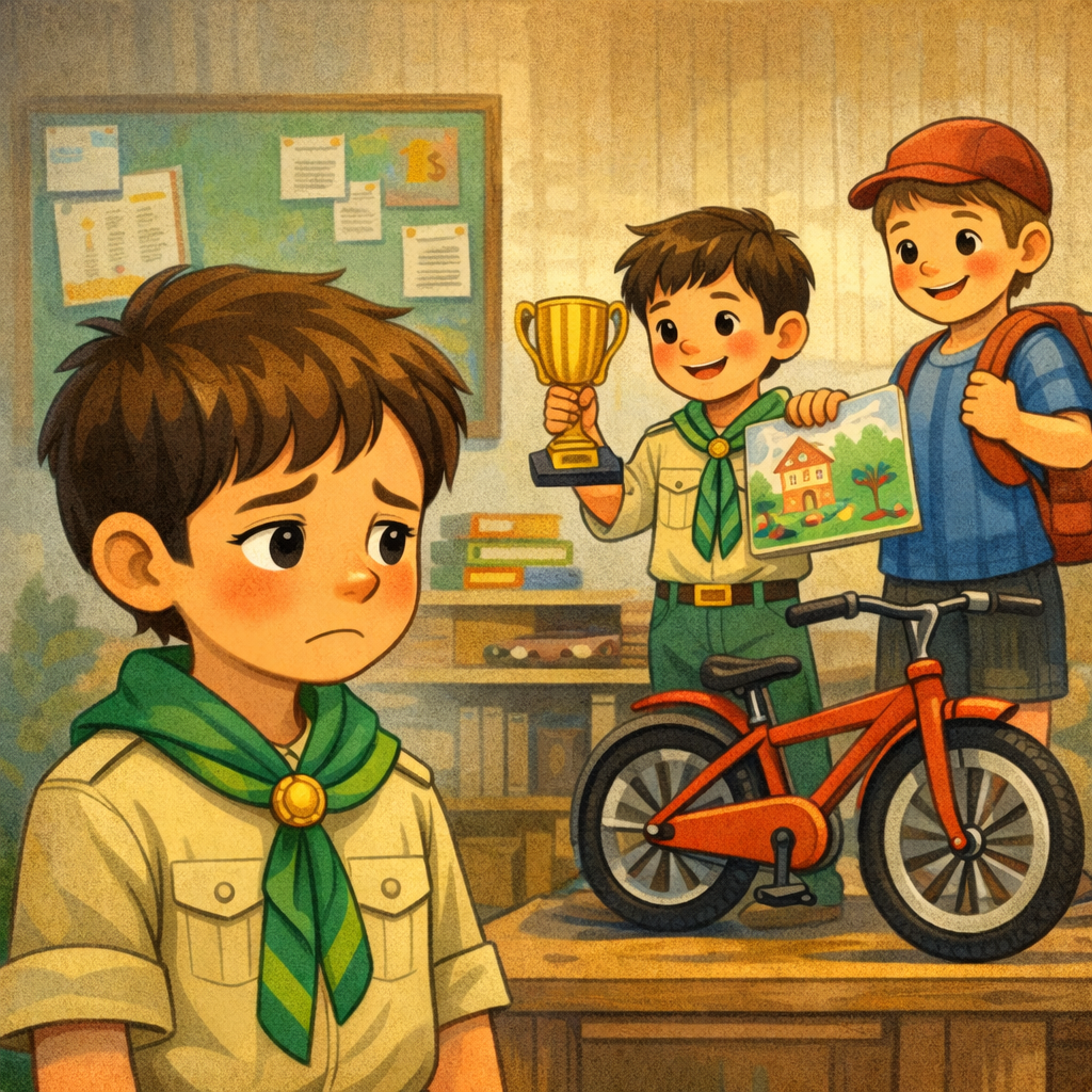 Και ο Παναγιώτης… Αχ, ο Παναγιώτης! Μια μέρα ήρθε στο σχολείο με ένα ολοκαίνουριο ποδήλατο. Κόκκινο, γυαλιστερό, με κουδουνάκι που έκανε «ντιν-ντιν».