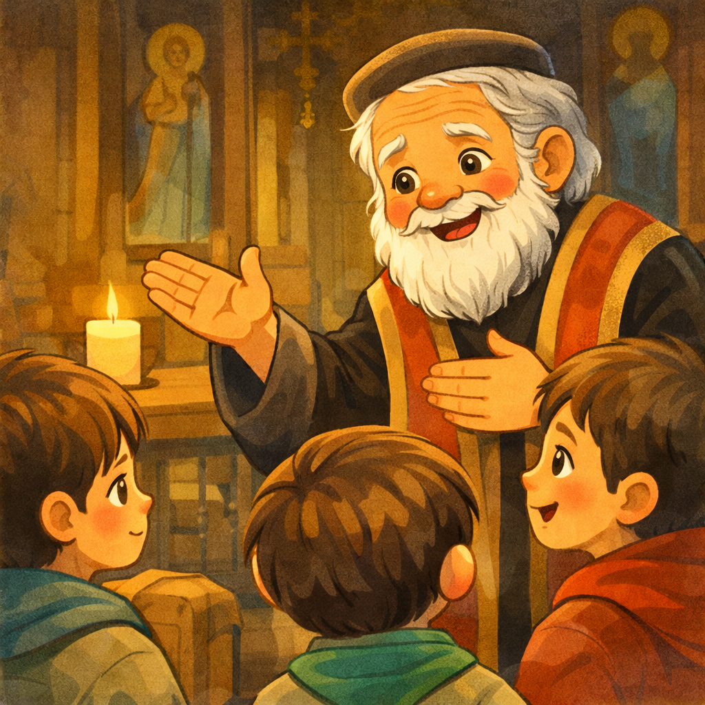 Στην εκκλησία υπήρχε ένας ηλικιωμένος ιερέας με φωτεινά μάτια. Μετά τη Θεία Λειτουργία, πλησίασε τα παιδιά.